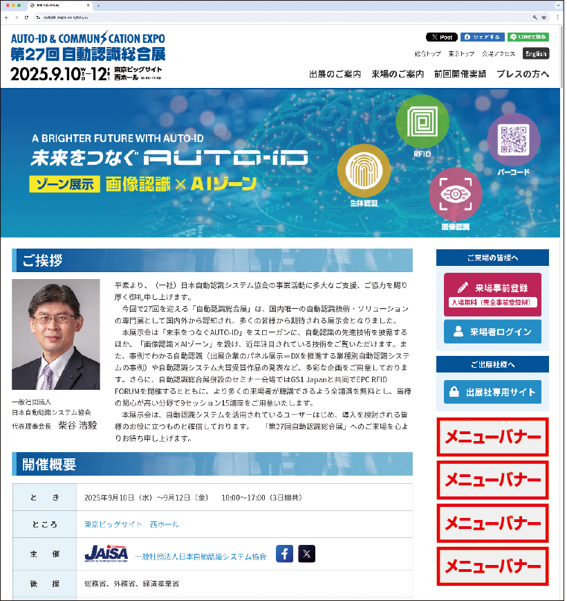 本展示会では、3月~10月下旬まで、インターネット公式Webサイトを立ち上げます。第28回自動認識総合展のインターネット公式Webサイトにメニューバナー広告を掲載することができます。