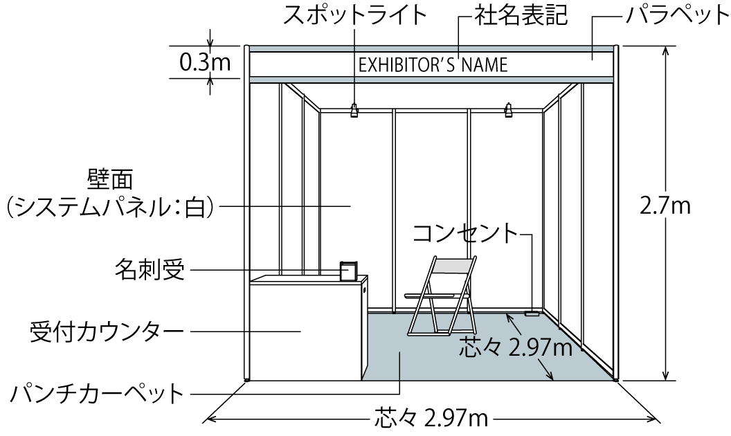 壁面:システムパネル・白(W2.97m×D2.97m×H2.7m)/パラペット:システムパネル・白(H3.0m)/受付カウンター:白(W0.9m×D0.45m×H0.8m)/床面:カーペット貼り(3色から選択)/電気:幹線工事費・電気使用料 1kW以内/LED蛍光灯20W×1、LEDスポットライト15W×2/コンセント1個/備品:折りたたみ椅子 1脚、名刺受け 1個/社名表示:ゴシック体、黒 一組