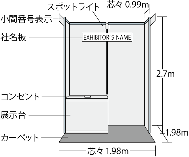 間口1.98m×奥行1.98mの展示スペース、基礎パネル(後壁、側壁0.99m)、社名板、カーペット、展示台:横幅0.99m×奥行0.99m×高さ0.8m、スポットライト:22W×1、コンセント(アース付100V):2個口×1、500Wまでの電気幹線工事費・電気使用料