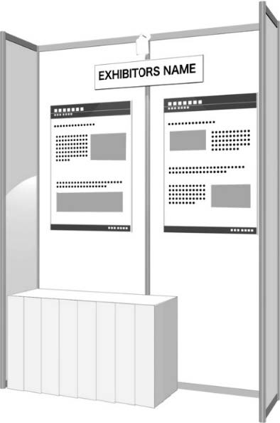 後壁、社名表示、スポットライト1個、カタログ展示用テーブル、名刺入れ