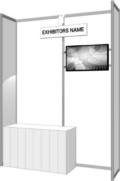 後壁、社名表示、スポットライト1個、カタログ展示用テーブル、電源、32inch液晶画面1台(スピーカー内蔵)、USB(映像自動再生設定)、名刺入れ
